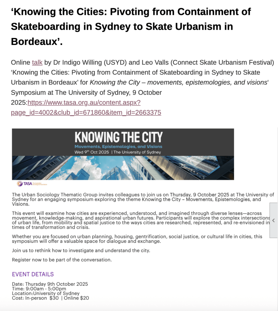 ‘Knowing the Cities: Pivoting from Containment of Skateboarding in Sydney to Skate Urbanism in Bordeaux’ for Knowing the City – movements, epistemologies, and visions‘ Symposium at The University of Sydney, 9 October 2025