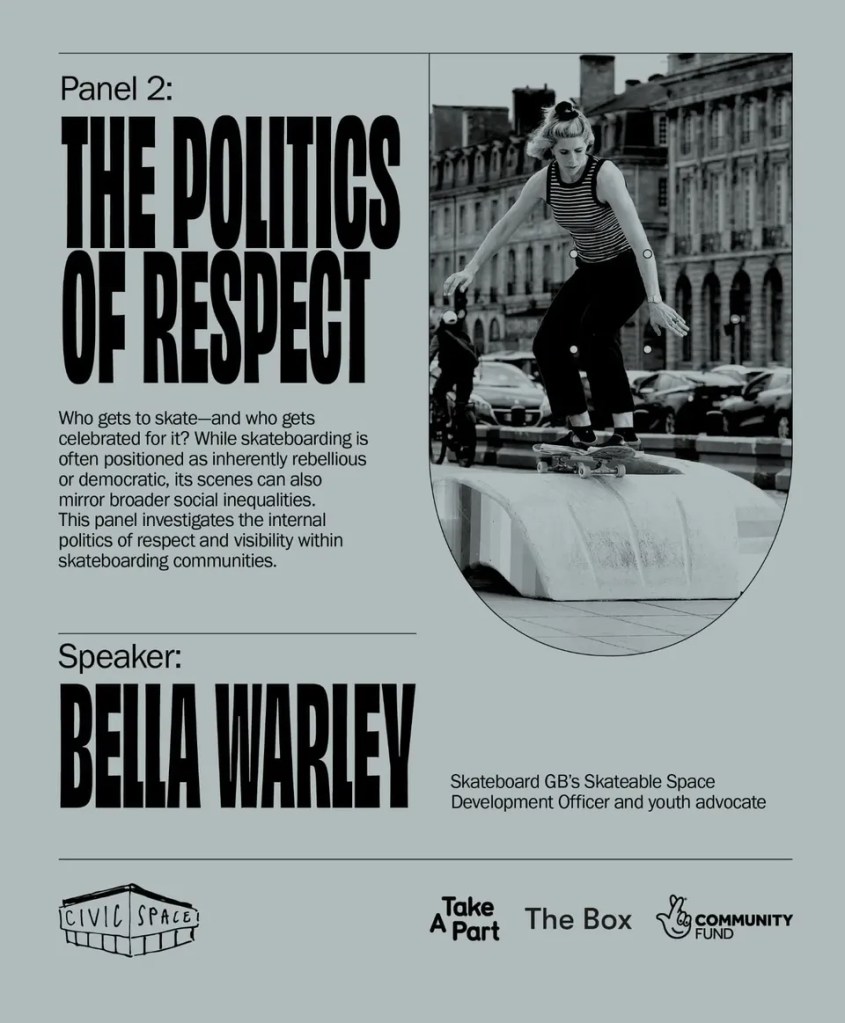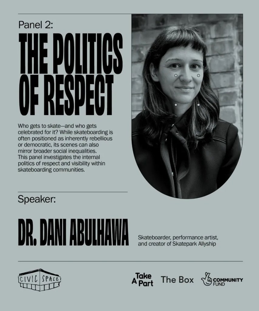 Panel speaker for The politics of respect: access and inclusion in skateboarding’s cliques, communities and spaces. Panelists: Dr Dani Abhulhawa, Dr Indigo Willing and Bella Ward. Chair Lucy Elmes 6 – 7 June, 2025. Plymouth, UK. Info